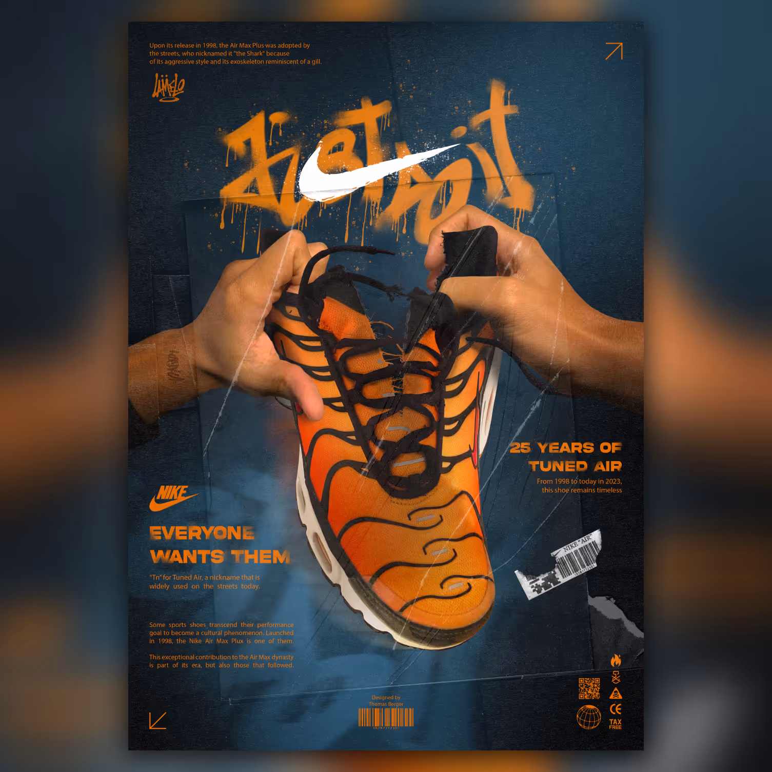 Ces affiches pour Nike, réalisées pour célébrer les 25 ans de la TN, mettent en scène une paire de TN se déchirant, symbolisant la forte demande. J’ai créé deux affiches au style mêlant le vintage et le moderne pour souligner l’intemporalité de ces baskets, montrant qu’elles sont convoitées par tous, peu importe l’époque. C’est un projet personnel.